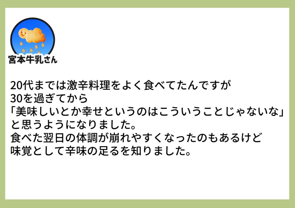 質より量から量より質。胃もたれしない程よいものにどれだけこだわりを持てるかが、若い頃の大食いや激辛といった食への探求心の代わりになった気がします。ラーメンからそばへ…。みょうがの良さに気付くように苦みやスパイスにも良さを感じられるのも楽しみな気がします。ルーティーンに変化が欲しくてカルディでカレーとコーヒーを買いあさります。