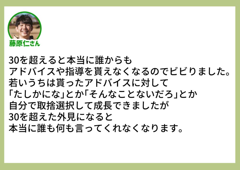 成長するチャンスを逃してしまうということは確実にあります。アドバイスの内容によっては取捨選択が必要ですが、きっかけすらなくなると自分が今大丈夫かわからなくなり、指摘されないまま気づかずモンスターになってしまう恐ろしさがあります…。30歳というのはある程度の人生の集大成という位置づけなので今更言っても…と気づいても言葉を引っ込める側の気持ちもわかるような…。言ってもらえる存在と言うのは貴重なんだ…嚙みしめつつ周りの人を大切にしたいです。