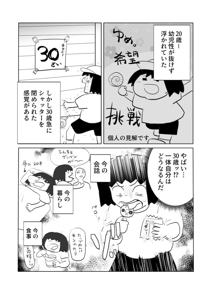 こちらもヒィっとなりました。「お金ないんだよね~」と言うセリフ、何歳が言うかによってだいぶ印象変わります。もうこの年でこれ言うと「大丈夫⁉」になるのか…。貧乏になっても漫画のネタに出来れば…ッという希望がありましたがコツコツ働いて安定した暮らしをしているほうが読者さんも安心して読めるかもしれないのか…。