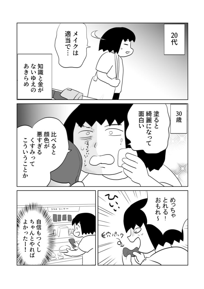 皮膚の調子が悪いことをプラスにとらえられた部分もありました。20代はメイクって「好きでもない自分の顔と向き合う時間」という印象であまりやる気が起きませんでした。しかし最近はお肌の調子が悪くなり、いろんな化粧品を購入し試すのが実験のようで楽しいです。マシになる!という感覚が嬉しい。まぁ気にしないで野面で外出する日もある。