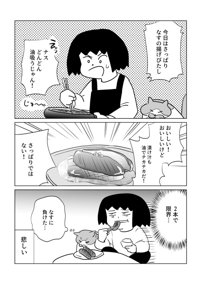 こんな悲しいこと漫画で伝えるのも情けないのですが、野菜だと思ってナスをあなどっていました。もう安い自炊の定番、焼いた肉と米!みたいなメニューも追々無理になりそうです。おひたしとか冷奴に喜びを覚えます。