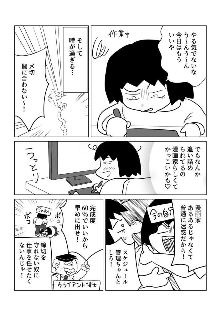 何故か作品に出てくる漫画家の姿はいつもヨレヨレで締め切りに追われている姿ばかり。その姿に憧れ〆切に追われる自分が少しかっこいいのではないかと陶酔していた時期もありました。それ、普通に迷惑です。今頂いている仕事や担当さんを大切に。スピード重視の気概でやりたいです。