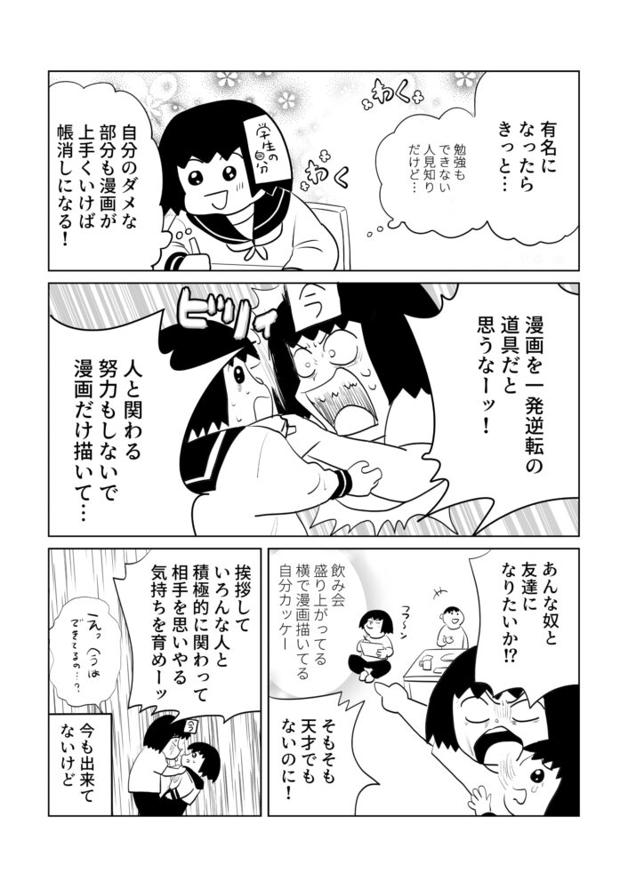 自分のやりたいこと、得意なことを突き詰めるのは楽しいですがそれを「一発逆転の道具」だと思い始めてしまうと途端にバランスの悪い傲慢な人間が出来上がってしまう恐ろしさがあります。人間は総合力。「この人の作品めちゃくちゃ面白いけど会うと全然喋ってくれない…」なんて人、友達になれない…。外に出ていろんなことを体験しないとそもそも漫画は描けないということもやっと知りました。