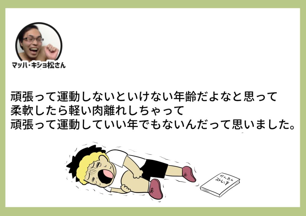 こどもの頃ダラ~ッとやっていたストレッチが大人になって大事な健康の生命線になっています。休み時間にドッジボールなんてしなくなるので固くなった普段動かさない筋肉が些細なきっかけで痛み出してしまう…自分の体は壊れやすいものだと思ってポリネシアン柔軟から始めます。お大事にしてください…。