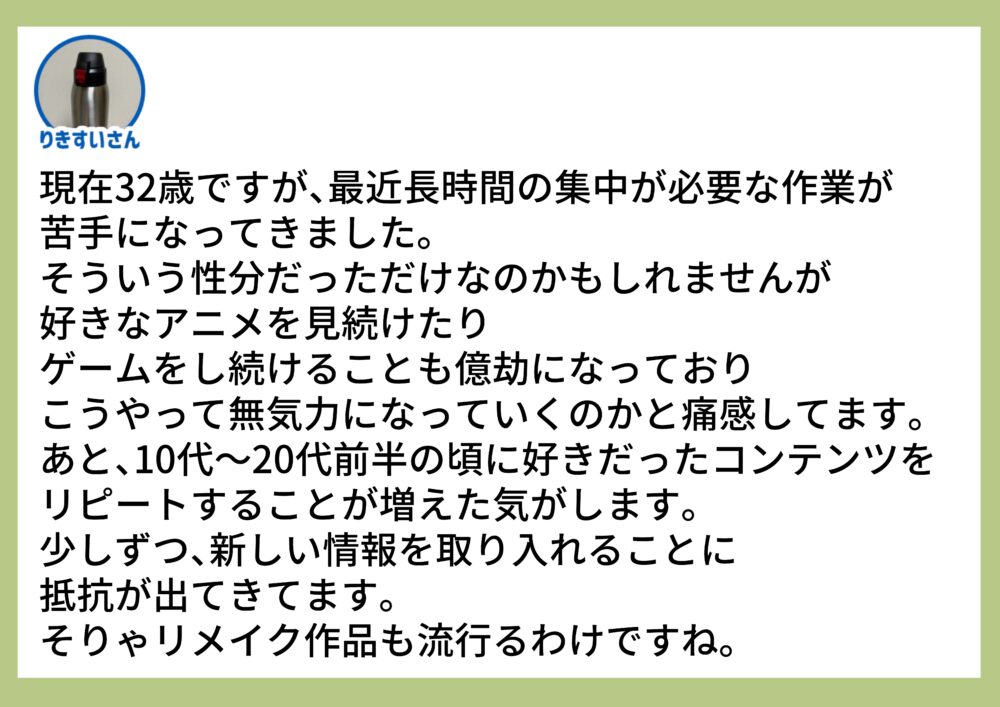 本当に、集中力がもちません。叫び出して走り回りたい衝動に耐えながらデスクワークしています。あんなに夢中でやっていたゲームやアニメが、遊びすらも億劫になってしまう日が来るなんて…。幼少期の集中力ってとんでもなかったんだなーと実感しております。知らない情報があっという間に溢れかえり、今となっては知ってるコンテンツは心のオアシスのような存在です。1から知らないものを知る行為に、脳が追い付けるのか足がすくんでしまいます。シャーマンキング、るろうに剣心、ぬ~べ~、うる星やつら…リメイクがありがたい。