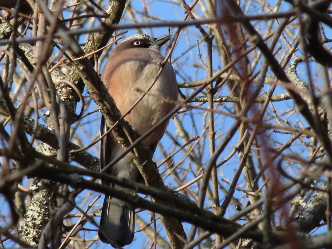 施設から出ていつものように野鳥を探す。頭上で「ガー」「ギャー」という鳴き声がして、「カケスかな?」と思って見上げるとカケスがいた。