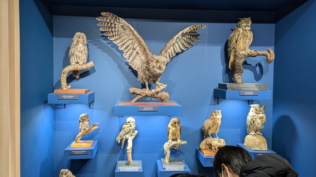 国内外の鳥の剥製がいっぱい見れてマジでうれしかったです。剥製は図鑑と違って立体で眺められるからサイズ感がよりわかりやすく、「サンコウチョウってこんなにちいさいんだ!?」「シマフクロウでかすぎる!!!」みたいな驚きがいっぱいあってよかったです。