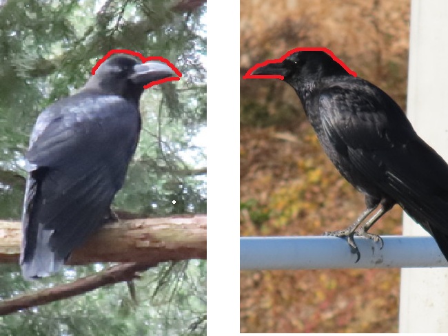 実際はクチバシよりも頭の形のほうが見分けやすく、ハシボソガラスがクチバシから流線形の頭部をしているのに対し、ハシブトガラスはベースボールキャップのような丸い頭をしている。