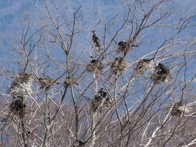 さいきんよく写真をとるスポットでカワウを見かけるようになり、その生態をインターネットで調べているうちにいろいろなことを知った。まずカワウはアユなどの水産資源を食べてしまうことから人間に不利益をもたらす一面があること。そのため人為的に数がコントロールされていること。山梨県においてはカワウのコロニーは1か所になるよう管理されていること。その1か所のコロニーが笛吹川流域にあること。そういうことをふまえて、コロニーを見に行ってみた。行ったら、めっちゃいた。