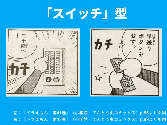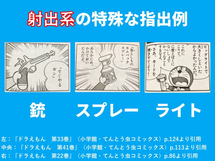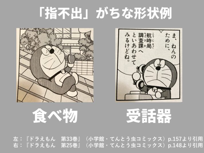 受話器そのものがひみつ道具として出るケース(図右)や、ひみつ道具の稼働に必要な食べ物(図左)の場合は、指が出る傾向にあります。