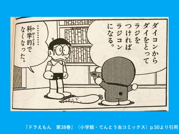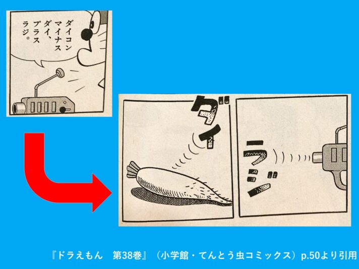ちなみにこのダイコンは、「ある物体」を「それと近い物体」に変換するひみつ道具である「物体変換銃」の素材として登場します。