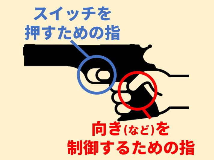 射出スイッチを押すための指と、射出方向を制御するための指。
