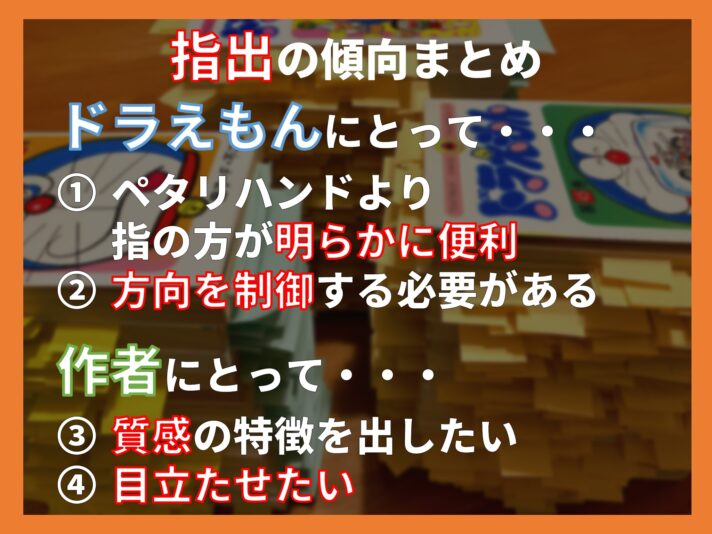 ドラえもんにとって、作者にとって、それぞれ理由があって指が出ているという傾向を僕は見出しました。