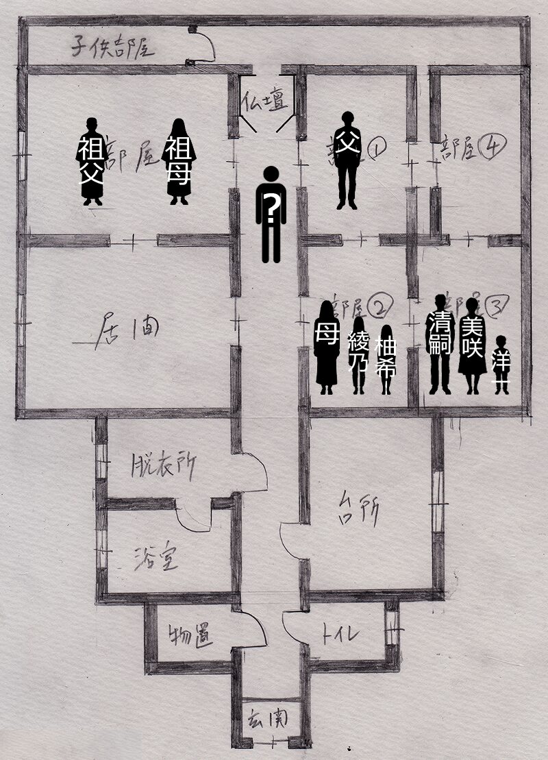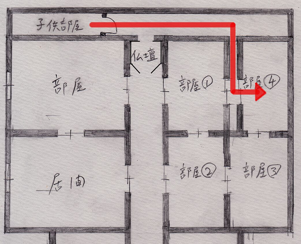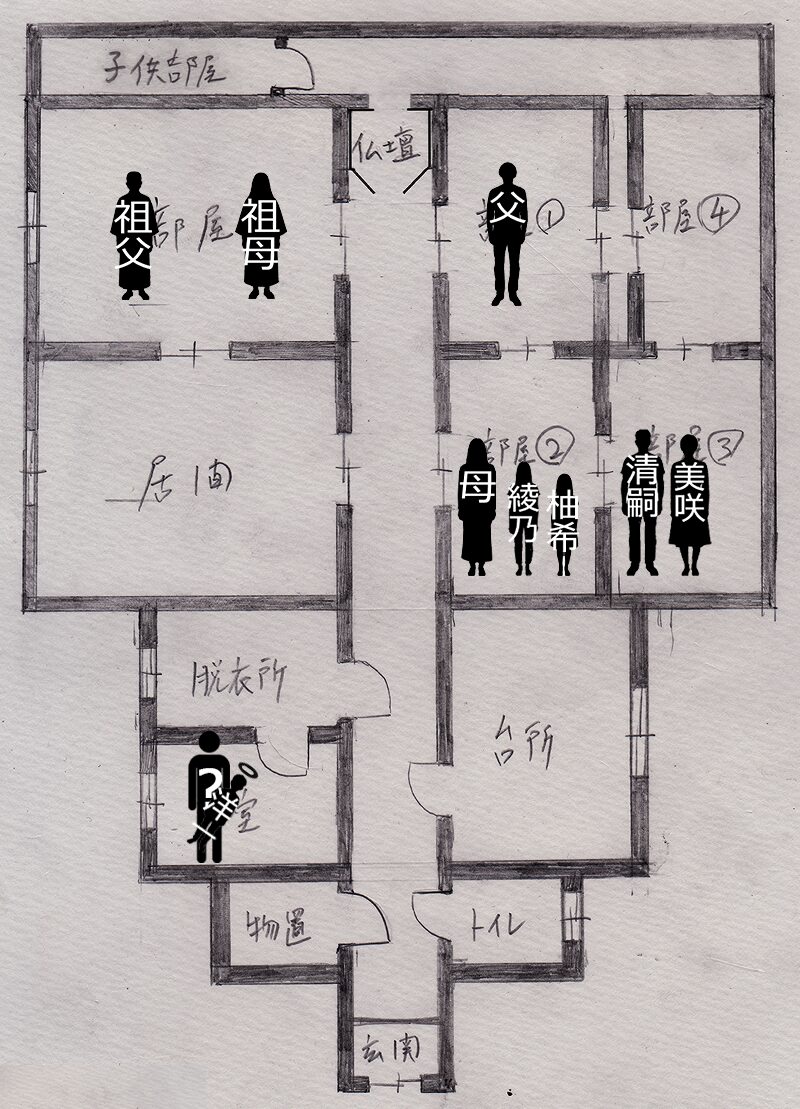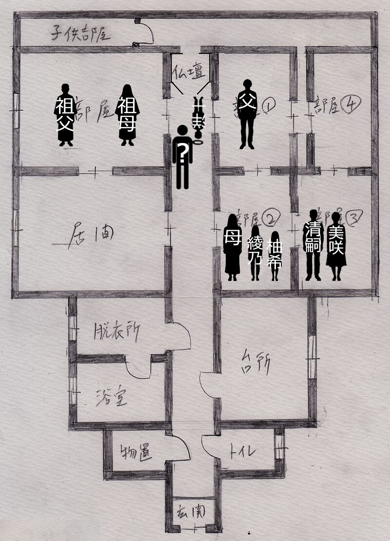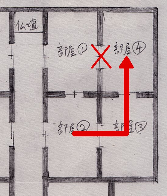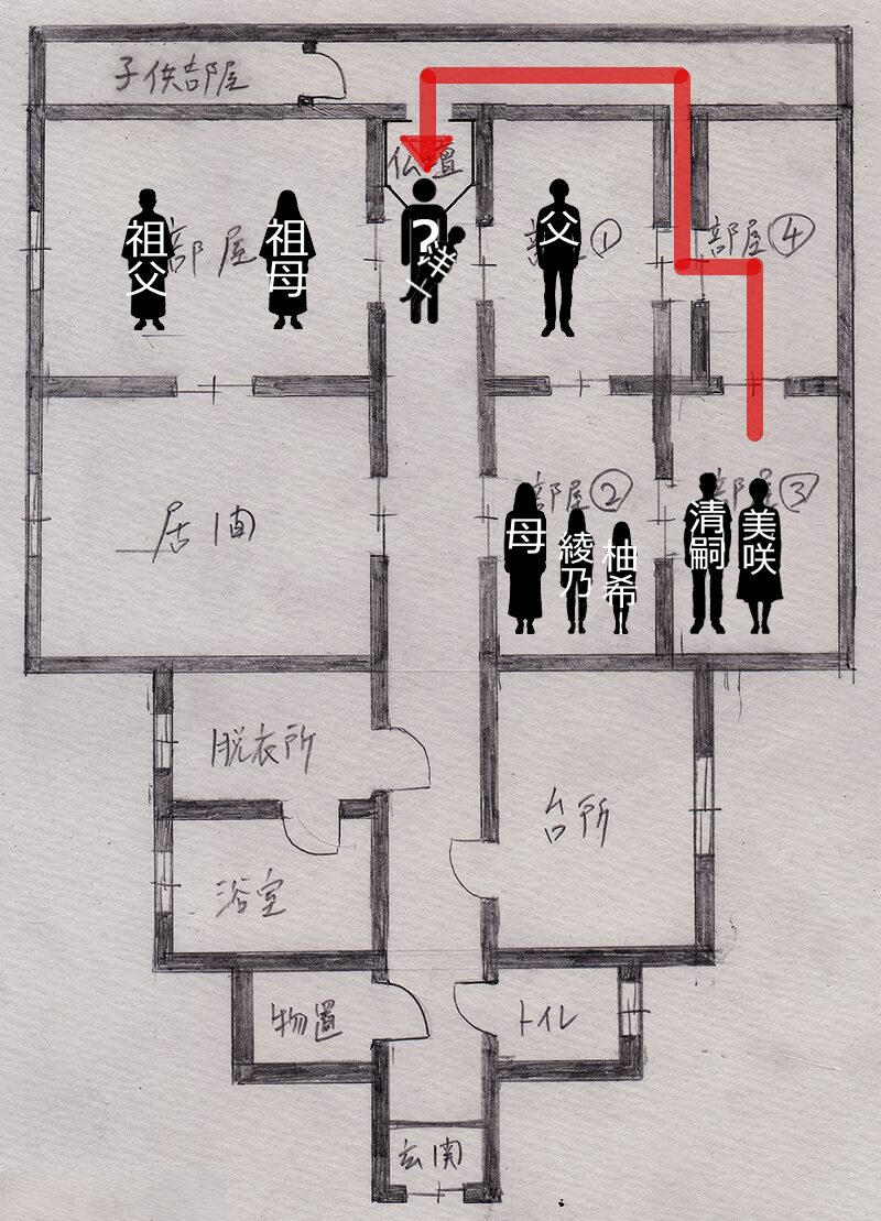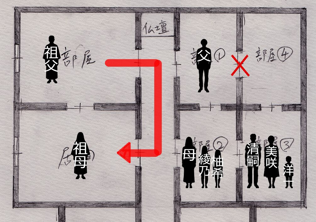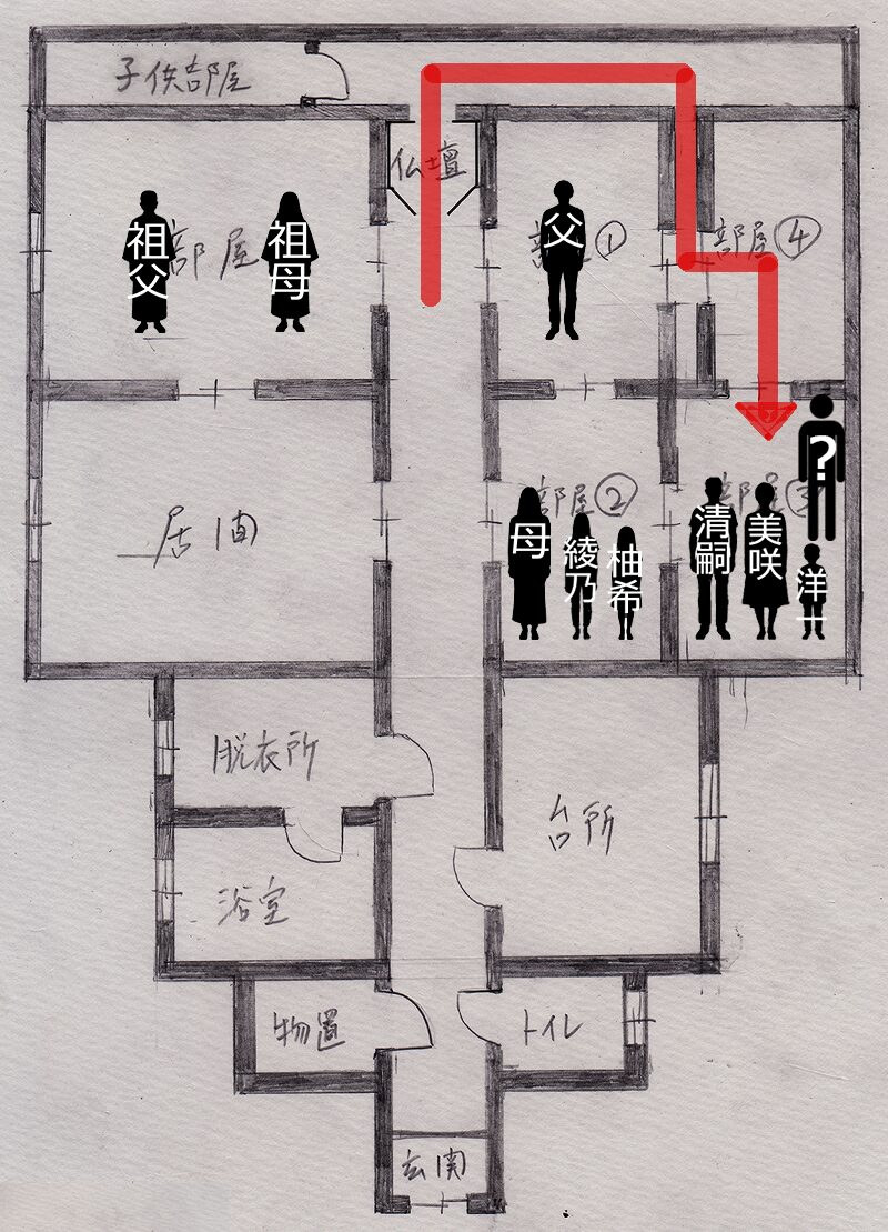 そして③の部屋から廊下に出るには、柚希さんの部屋を通らなければならないので、ようちゃんの両親も除外します。