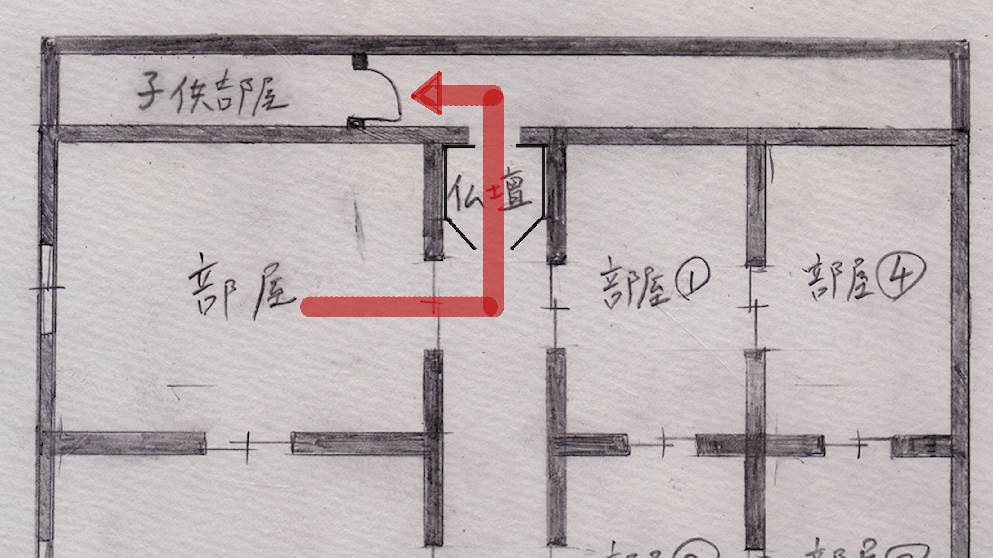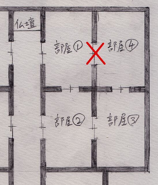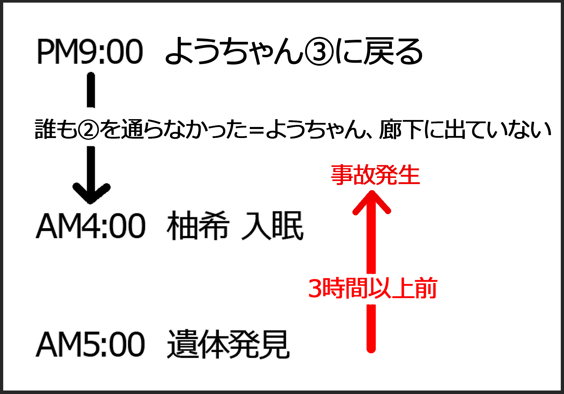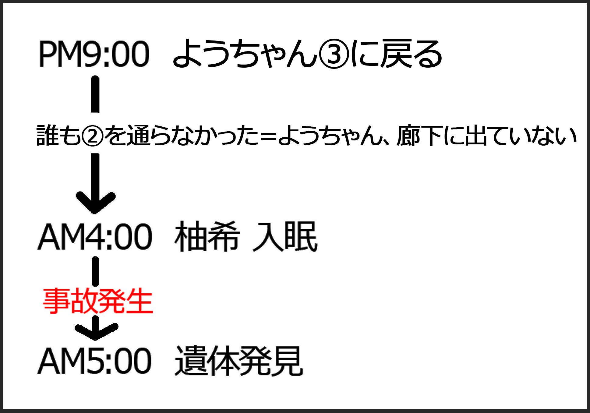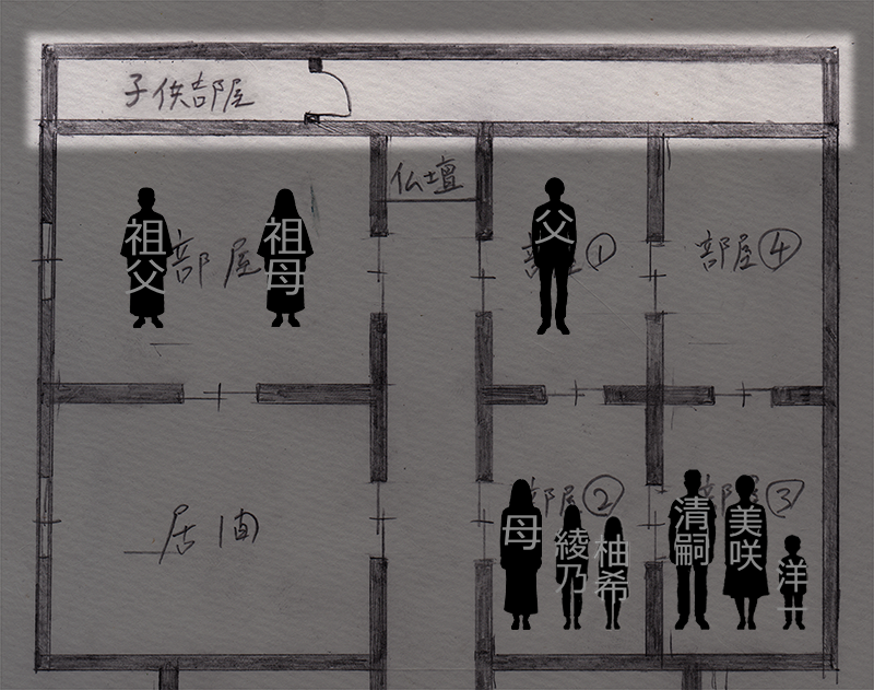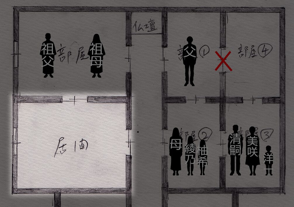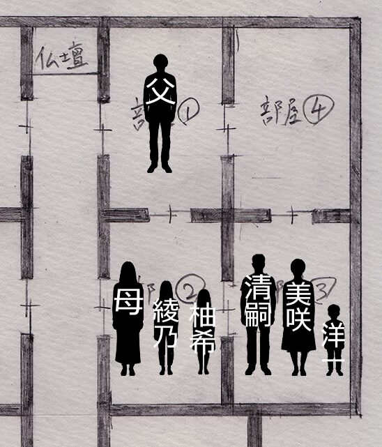 そして③の部屋から廊下に出るには、柚希さんの部屋を通らなければならないので、ようちゃんの両親も除外します。