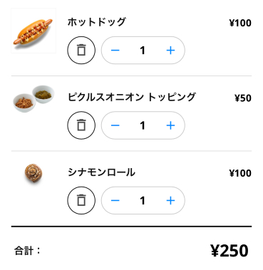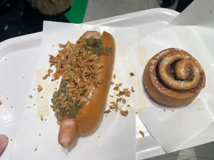 安くて人気のホットドッグとシナモンロールを注文。