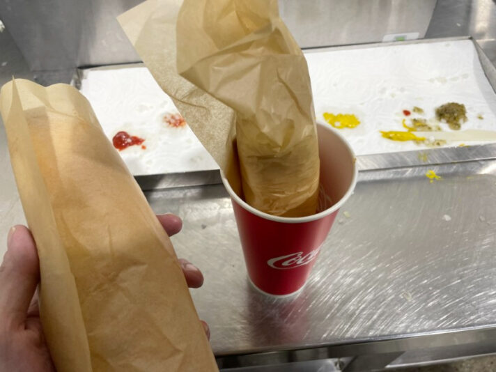 紙コップに乱雑に放り込まれた包み紙に包まれているのがホットドックだ!