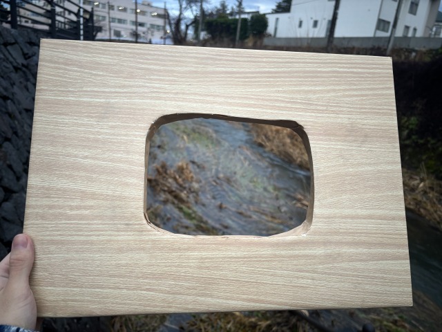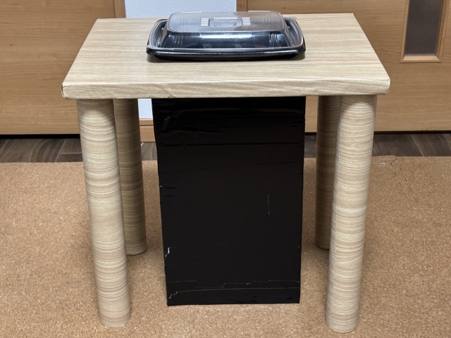 発泡スチロール板の中央に弁当容器サイズの穴を開け、これに脚を装着する。