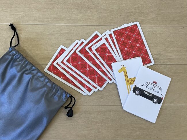 この袋に様々な動物と乗り物のカードが入ってるので、片方のプレイヤーはサイコロを振り、出た目の数だけ袋の中を見ずにカードを引きます。そしてカードに動物と乗り物のどちらが描かれているかを確認するんですが、最初にサイコロを振るプレイヤーはジャンケンで勝ったほうです。それで動物のカードだったときは足の数を見て、乗り物だったらタイヤの数を見ます。たとえばサイコロを振って出た目が3だったらカードを3枚引くんですが、それがイリエワニとシジュウカラとデーモンダンプだったときはイリエワニは足が4本でシジュウカラは足が2本でデーモンダンプはタイヤが3個だからそれを合計した数は8になります。その合計の数を自身の身長を二乗した数で割って出た数字をカードじゃない別の紙に書くんですがその数字は相手に見られてはいけませんが自分は見てもいいです