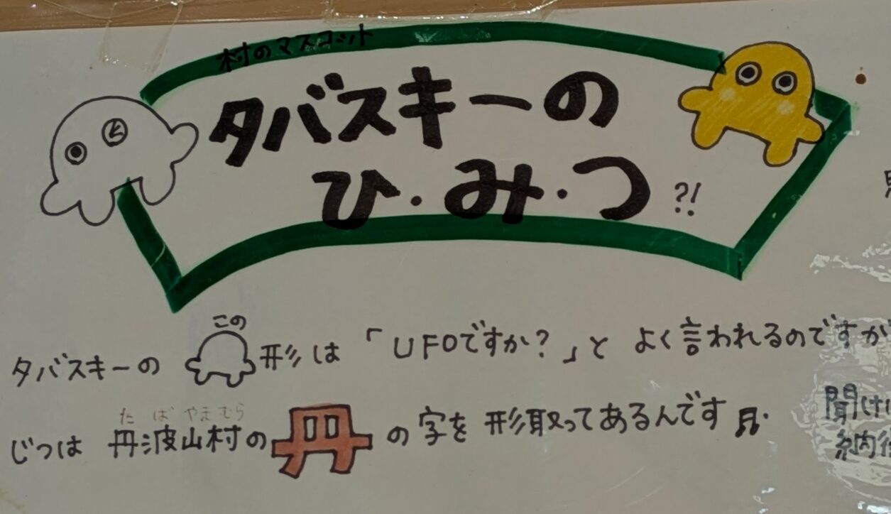 丹波山の「丹」の文字をモチーフにしたUFOのような形と「アダムスキー型」にもかけ「丹波山が好き〜」という思いで「タバスキー」と名づけられました。