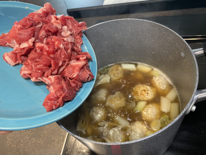 で、里芋にすっと箸が入るようになったら牛肉を投入。