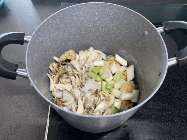 そのまま鍋にネギ・舞茸・里芋をぶち込んでサッと炒めます。