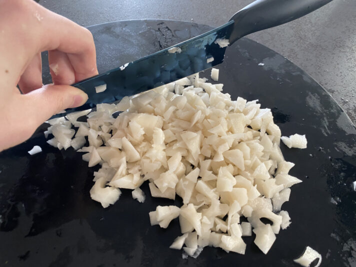 水から引き揚げたレンコンをみじん切りにして