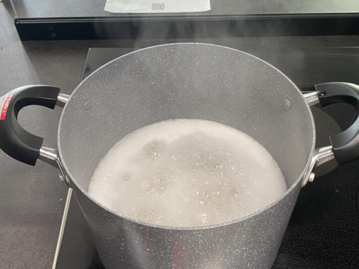 そしたらぬめりを取るために軽く下茹でします。水の量はテキトーで大丈夫です。どうせ捨てるので。