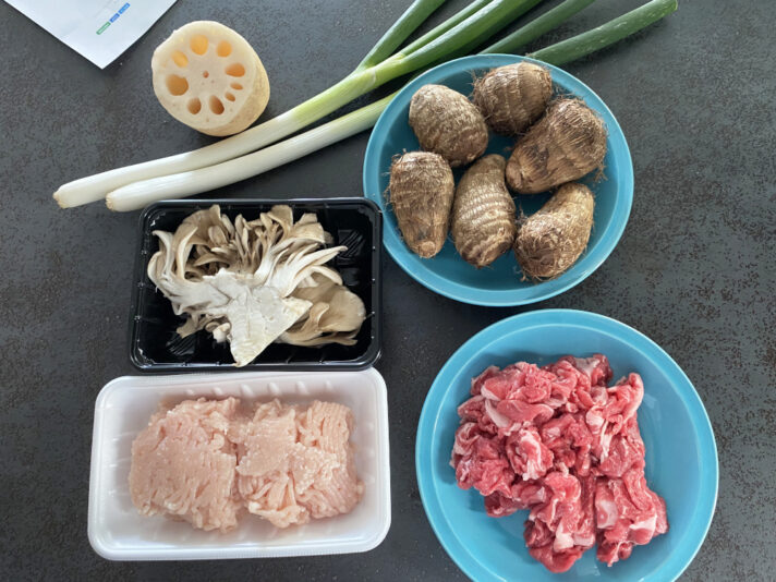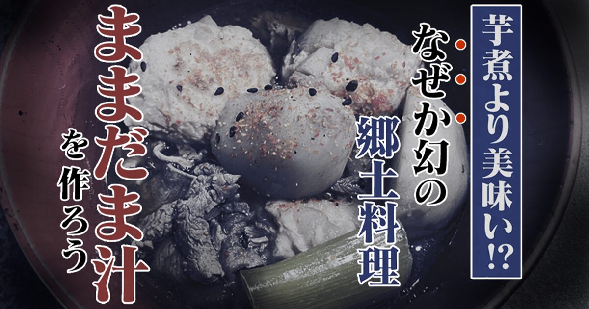 ままだま汁とは「醤油味のスープで牛肉、里芋、根菜入り鶏団子を煮込んだ汁物」のこと。