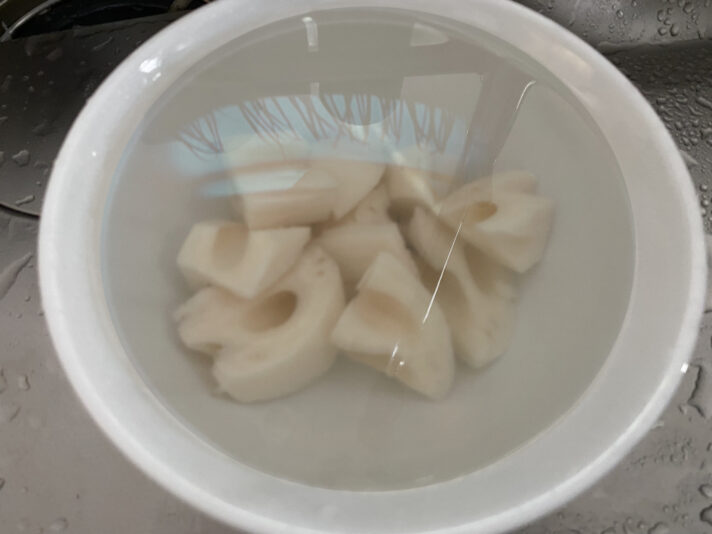 レンコンは皮を剥いて5分くらい水にさらす。