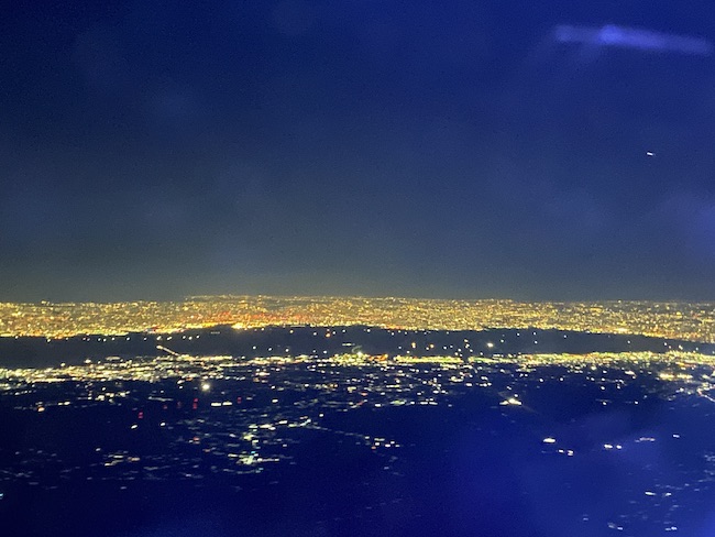 飛行機から見える東京の夜景(多分東京だよなこれ)。おかしいだろ、なんだこの明るさ。誰もおかしいと思ってないのか。ちょっと待ってろ、九州の夜を見せてやるから。