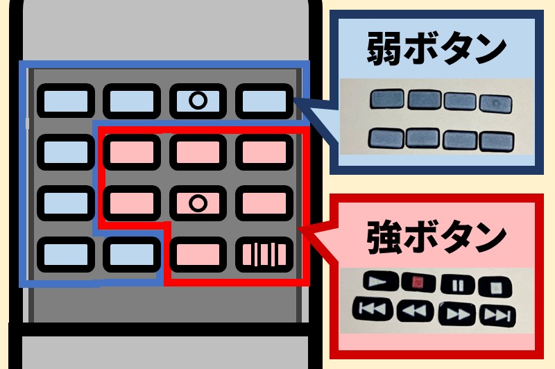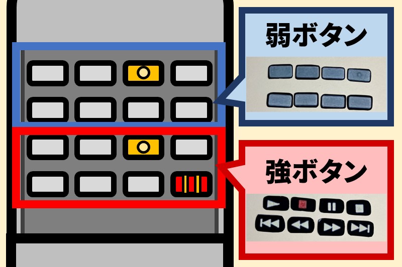 つまり相対的に目印の多い下半分が特徴の強い強ボタンエリア、上半分が比較的特徴のない弱ボタンエリアということです。そして直感的に、「その他」感のある青無字ボタンよりも、再生系ボタンの方が「強い」。これが理由です