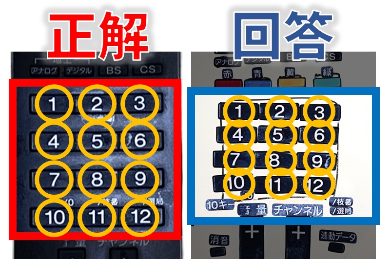 最上段は、全体的に左右あべこべになってしまい、正解といって良いのは1個だけでしたね。特殊色の「電源ボタン」と「シアターボタン」の位置が対角線上になってるのは、僕のバランス理論と同じ発想なので嬉しい