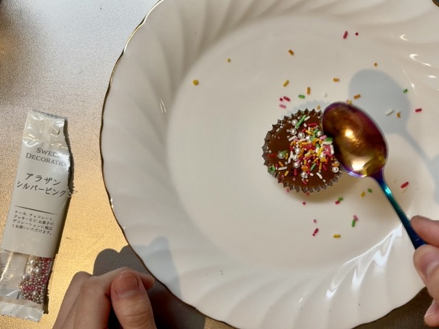 チョコレートを流し込む前に、巨大女児チョコにふさわしいカラースプレーとアラザンを用意する。