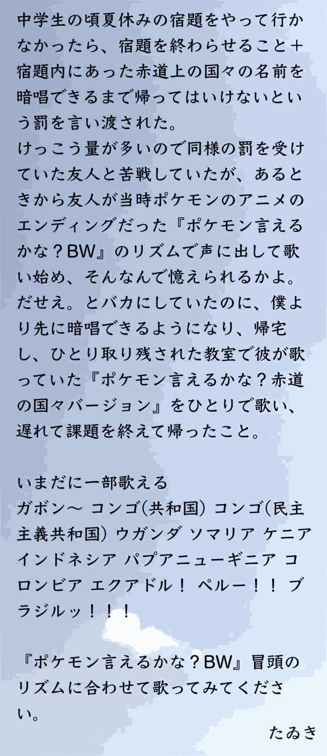 後半もすごいけど何より「赤道の国々を暗記するという罰」がなんだか変で面白い。なんだその罰。