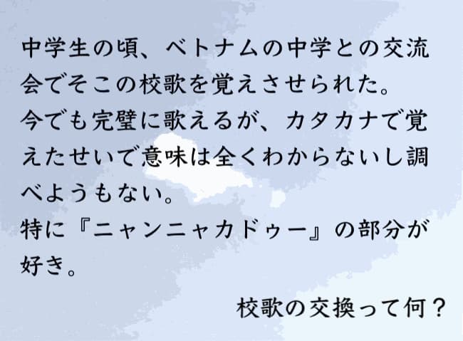校歌ってベトナムにもあるんだ。ベトナムの人も意味わからんまま日本語の校歌覚えたのかな。