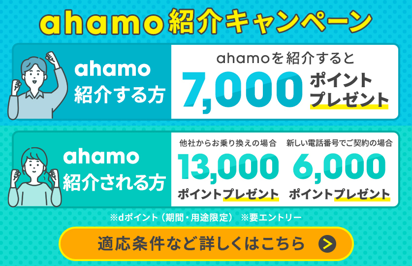 キャンペーンサイトにて、ahamo契約者がエントリーのうえ、「紹介用URL」をahamo未契約者へ共有。紹介された方が紹介用URLからエントリーの上、ahamoをお申込み・開通すると、紹介する方・紹介された方どちらもdポイントが貰えちゃいます!