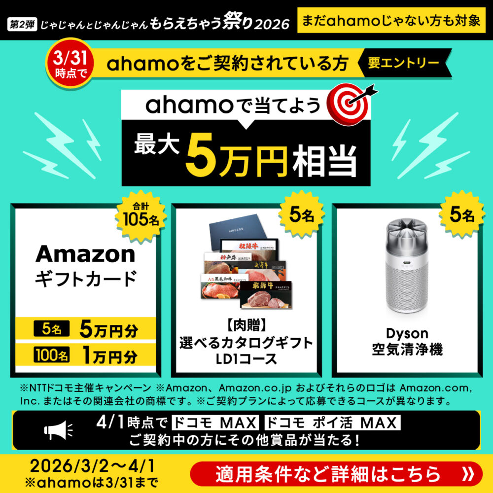 加えて、3月31日時点※5 でahamoをご契約の方を対象に、豪華景品が抽選で当たるキャンペーン「じゃじゃんとじゃんじゃんもらえちゃう祭り2026~第2弾~」も開催中です!※6