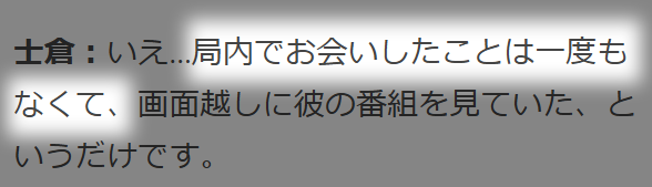 士倉:いえ…局内でお会いしたことは一度もなくて、画面越しに彼の番組を見ていた、というだけです。