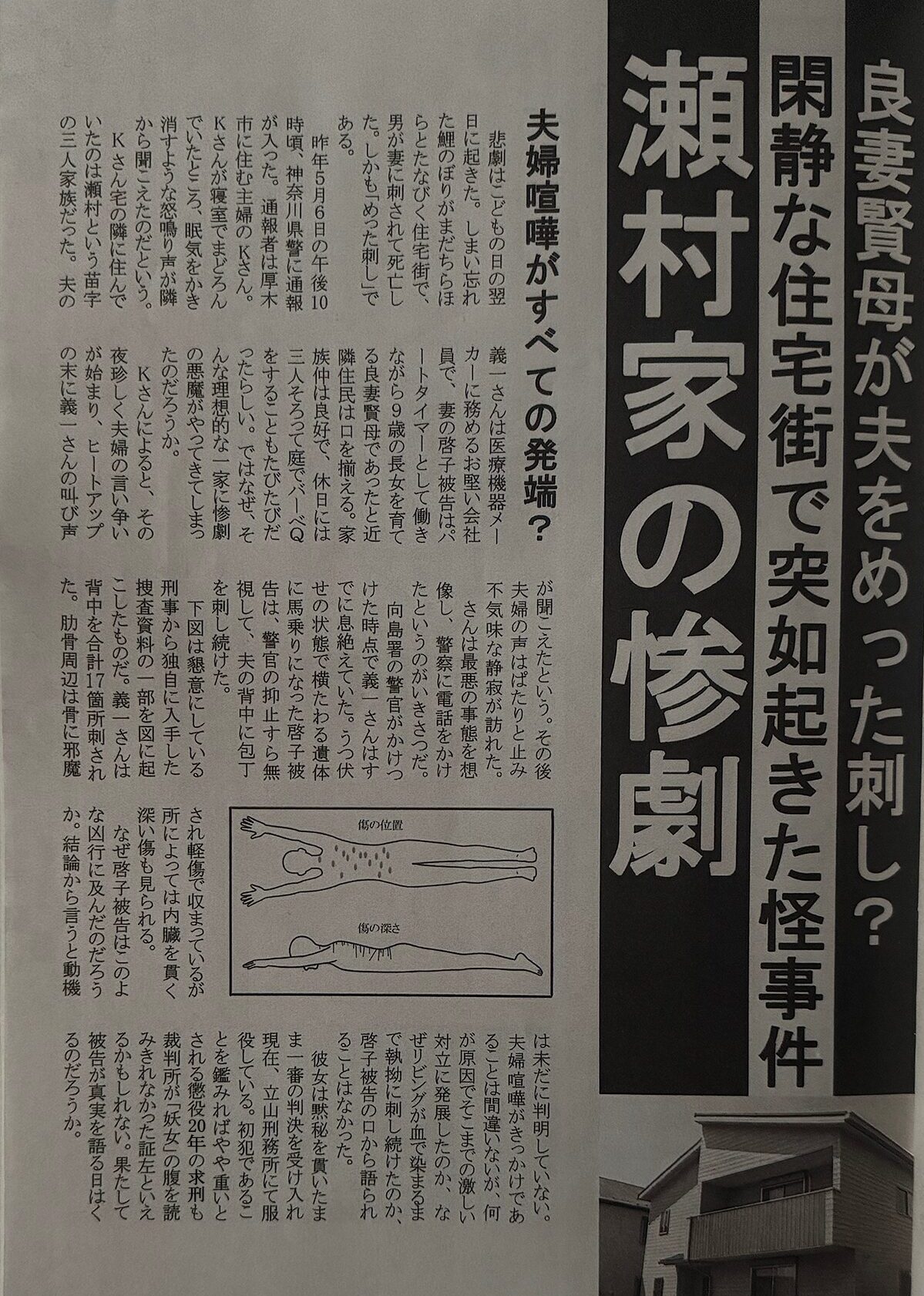 神奈川県厚木市に住んでいた専業主婦・瀬村啓子 被告が、夫の義一 さんを刃物で刺し、死亡させた。